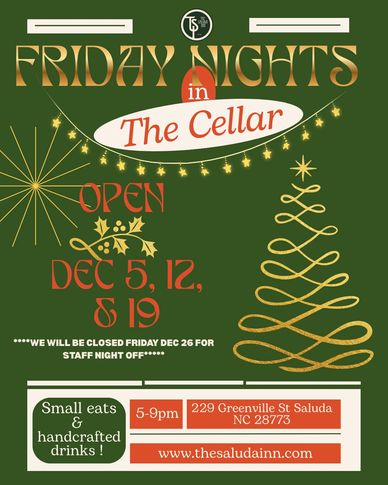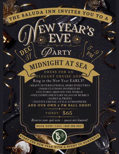 WEAR SOMETHING FESTIVE AND CELEBRATE FOOD FROM AROUND THE WORLD, GAMES, PRIZES, AND AN EARLY NIGHT TO RING IN THE NEW YEAR! THE SALUDA INN'S BALL DROPS AT 9:00PM. TICKETS REQUIRED, PLEASE CALL THE SALUDA INN 828-388-9027