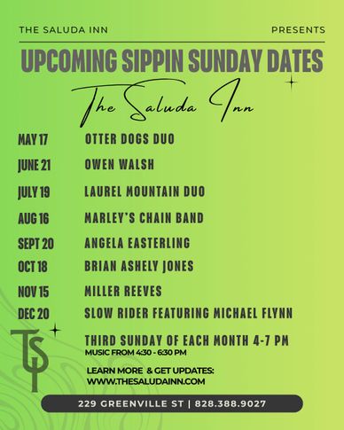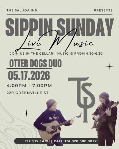 Join The Saluda Inn the wine cellar for SIPPIN SUNDAY, May 17, 2026, 4-7PM, Music starts at 4:30 and plays until 6:30PM. Sippin Sundays feature live music the third Sunday of most months in The Wine Cellar from 4-7PM. Preorder food when you book your ticket at your enjoy at your leisure during the performance! Please call the Inn for details, 828-388-9027