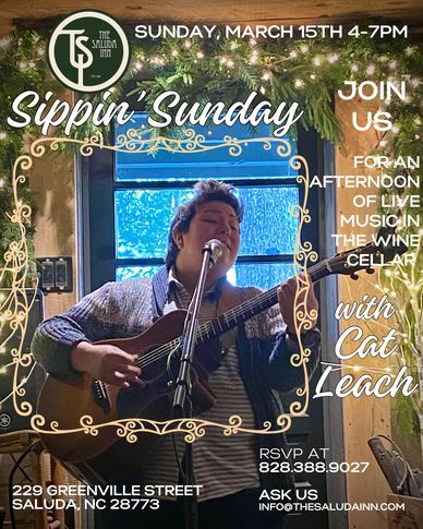 Join The Saluda Inn as we welcome Cat Leach back to the wine cellar for SIPPIN SUNDAY, MARCH 15, 2026, 4-7PM, Music starts at 4:30 and plays until 6:30PM. Sippin Sundays feature live music the third Sunday of most months in The Wine Cellar from 4-7PM