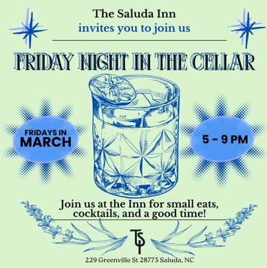The Cellar officiallywill be opened every Friday in the month of March at The Saluda Inn. Doors open at 5PM and the cellar closes at 9PM. We serve cocktails, wine, beer, and feature small bites for purchase! Come enjoy a night with friends!